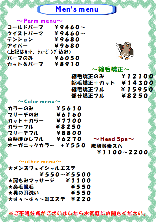 ※この他のメニューはお気軽にスタッフにお聞き下さい。(^^♪